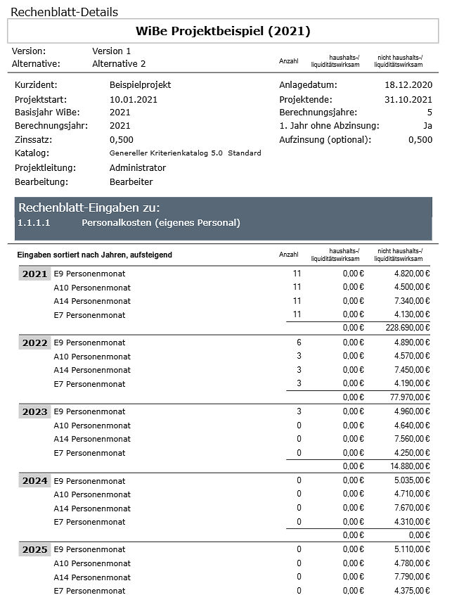 Für die Entwicklung und den Betrieb einer IT-Lösung wurde in früheren WiBe-Versionen ein Betrachtungszeitraum von insgesamt 5 Jahren empfohlen. Das aktuelle Fachkonzept fordert, für die Betriebsphase den Zeitraum des geplanten Wirkbetriebes anzusetzen. Die ermittelten (bzw. geschätzten) Beträge sind mit der Kapitalwertmethode abzuzinsen. Monetäres Ergebnis ist der Kapitalwert des IT-Projektes: ist er positiv, ist das Projekt wirtschaftlich (das gilt nur, wenn es sich bei den Nutzengrößen nicht um lediglich kalkulatorische Werte handelt – hier ist dann der Nutzen-Inkasso sicherzustellen).