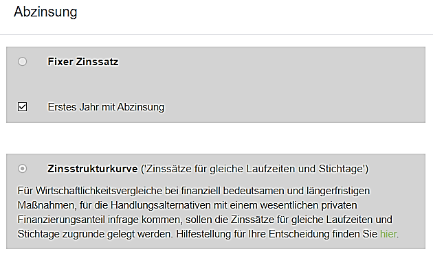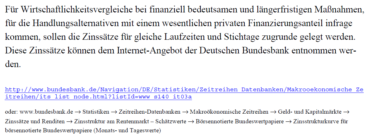 Die Entscheidung zwischen fixem Zinssatz oder Zinsstrukturkurve treffen Sie, indem Sie bei der Neuanlage einer Maßnahme zu Beginn einige SIB-spezifische Fragen1 beantworten. Anhand dieser Antworten wählt die Anwendung WiBe SIB die korrekte Option aus. Der gesetzliche Hintergrund dazu wird durch die Veröffentlichungen des Bundesministeriums der Finanzen gegeben; es findet sich u. a. folgender Hinweis: